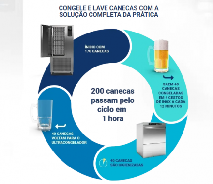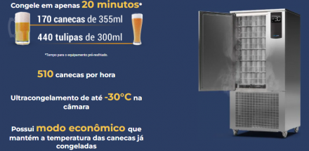 REF: 1727Ideal para bares, restaurantes e estabelecimentos que desejam oferecer canecas e bebidas sempre extremamente geladas, garantindo maior satisfação dos clientes e valorizando a experiência no consumo de bebidas. Desenvolvido para alto desempenho, o equipamento proporciona congelamento rápido e eficiente, mantendo as canecas na temperatura ideal para servir.