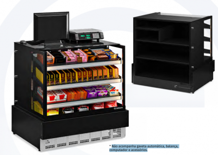 A iluminação LED perimetral frontal com interruptor valoriza os produtos expostos, tornando a vitrine mais atrativa. O equipamento conta com nicho para instalação de gaveta automática (não acompanha o produto) e depósito na parte traseira para armazenar embalagens e suprimentos, garantindo praticidade no atendimento.