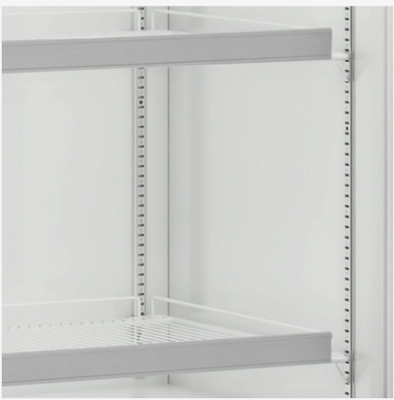 Possui 4 níveis de prateleiras aramadas reguláveis e inclináveis, facilitando a organização e reposição. O revestimento interno é em aço pré-pintado branco, enquanto o externo pode ser em aço pré-pintado ou aço revestido, garantindo resistência, durabilidade e fácil higienização. Conta ainda com pés niveladores e perfil porta etiquetas para melhor identificação dos produtos.